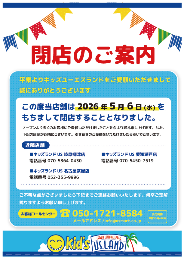 キッズユーエスランド 愛知大口店 閉店のお知らせ