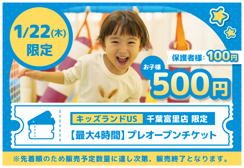 ※キッズランドUS 千葉富里店にて、1/22(木)のみご利用いただけるプレオープン専用チケットです。
