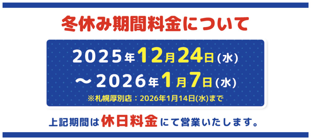※2025/12/24(水)~2026/1/7(水)の冬休み期間中、休日料金にて営業いたします。